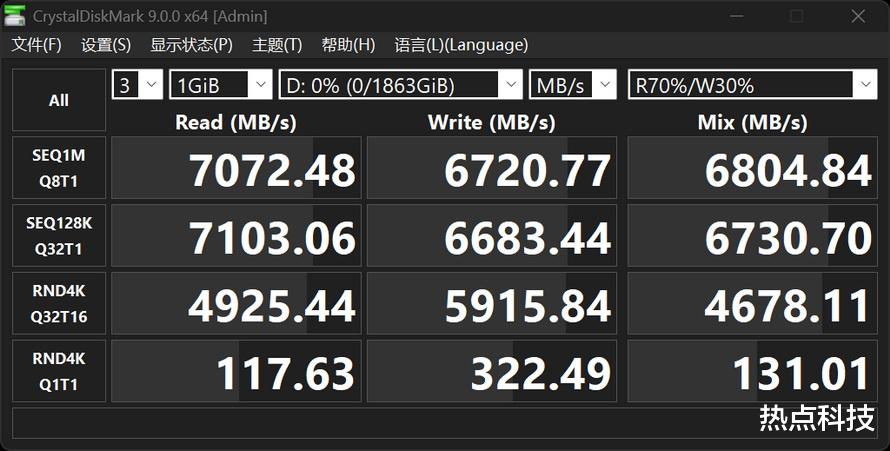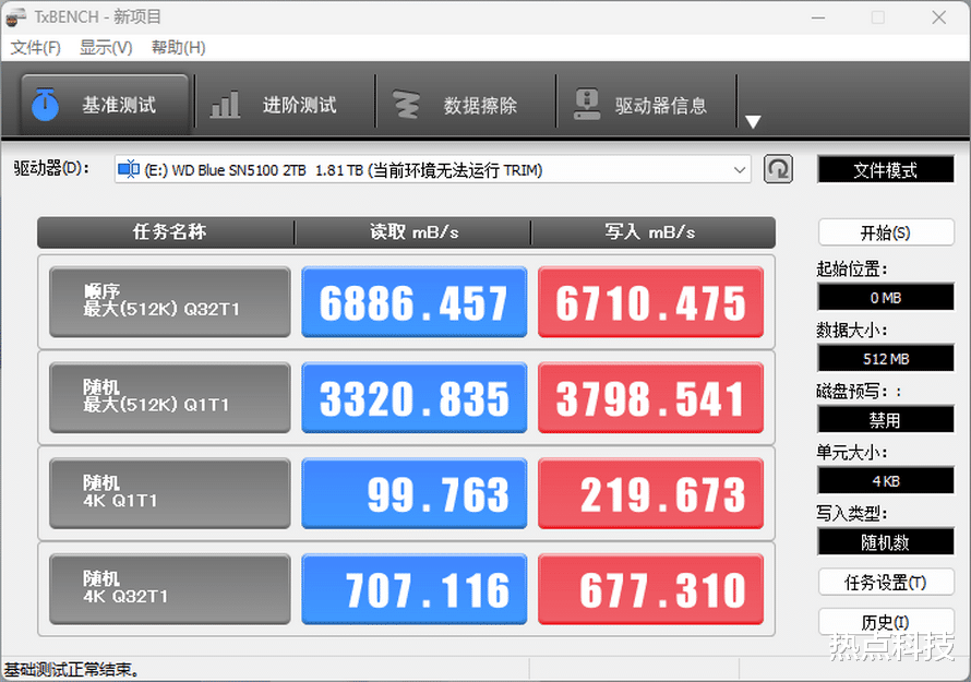 接下来是TxBench,在这款软件下闪迪SN5100顺序读取速度为6886 MB/s,顺序写入速度为6710 MB/s,写入速度超出标称值。