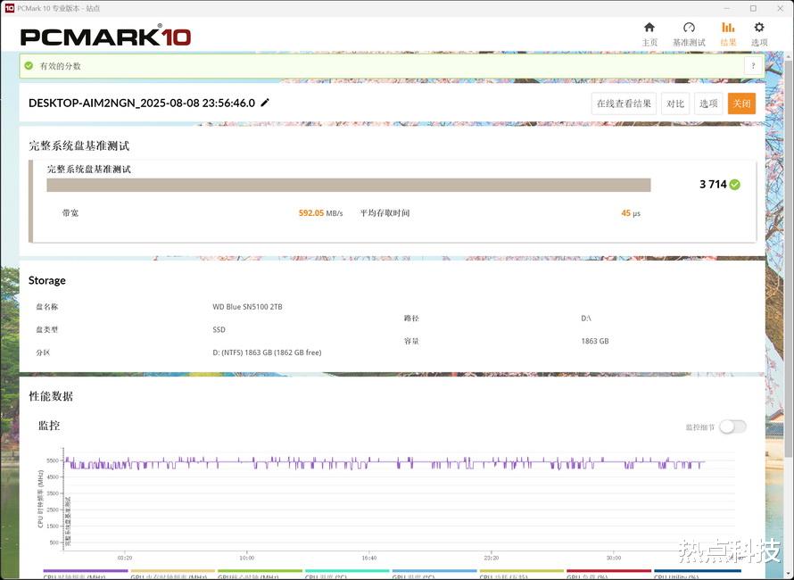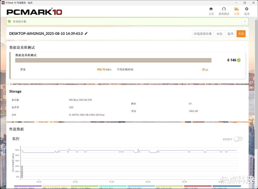 最后是经典的PCMARK与3DMARK测试,在PCMARK完整系统盘基准测试、快速系统盘基准测试以及数据盘基准测试中,闪迪SN5100得分分别是3714、4365、6146。