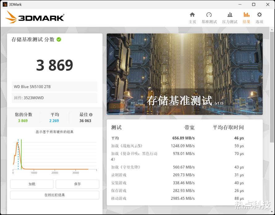而在3DMARK当中,SSD在存储基准测试得分是3869,平均带宽656 MB/s,平均存取时间46us,其中在《战地风云5》、《使命召唤:黑色行动4》中带宽分别达到了1248 MB/s、978 MB/s。