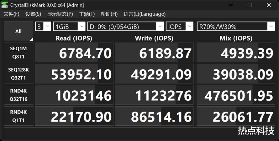第一项测试是CrystalDiskMark,闪迪SN5100在Intel平台上顺序读取速度为7072 MB/s,顺序写入速度为6720 MB/s;随机读写性能方面,读取为1023146 IOPS,写入为1123276 IOPS,实测随机读写速度要超出标称值不少。