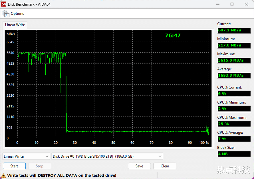 除了主动散热下AIDA64全部写入测试外,我们还测试闪迪SN5100在完全没有散热措施下的全盘写入性能,结果表现非常让我们吃惊。在没有散热措施下,闪迪SN5100完成Linear Write全盘写入测试耗时为78分12秒,与主动散热下差别不大。