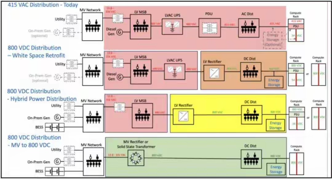 动态响应的精妙设计AI负载特有的毫秒级波动,要求供电系统具备极快响应能力。800VDC通过碳化硅器件将AC/DC转换环节从4次缩减至2次,既避免了电网冲击,又实现了能量路径的极致简化。白皮书披露的实测数据表明,新架构可降低45%铜耗,节省30%设备空间。