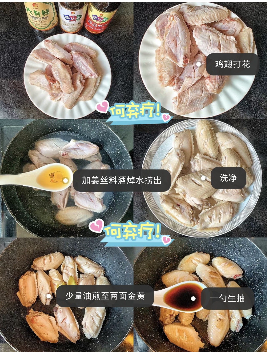 1.炒鸡翅的时候,一定要不停翻炒,刚下油锅的鸡翅,鸡翅皮很容易粘在锅底,如果开大火手忙脚乱的话,就开小火🔥做,不用着急,最后收汁的时候再开大火就好了