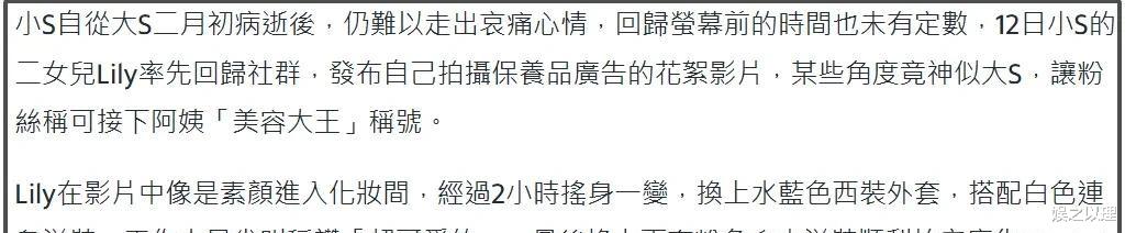 S家最近真是新闻不断!S妈天天在网上发文,说自己有多么多么想念女儿。虽说丧女之痛可以理解,但总是这样高调地表达悲伤,也难免让人觉得有点……用力过猛。更让人惊讶的是,小S的女儿们也开始活跃起来,尤其二女儿Lily,直接拍了广告,这是要正式出道,扛起S家的经济大旗了?