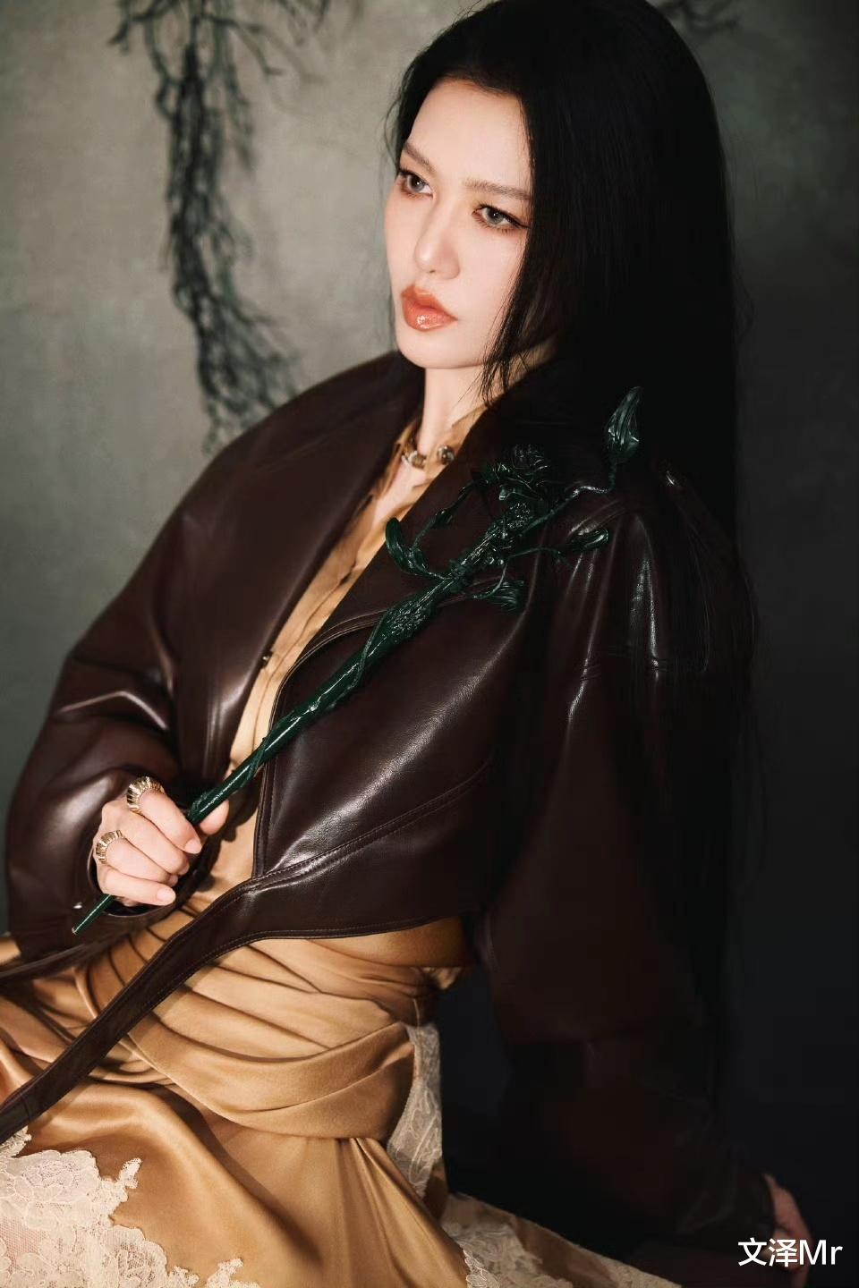 双手交叠置于腹前的姿态,让人想起她照顾收养的流浪狗时的温柔。米色长裙的蕾丝花边与皮夹克形成奇妙共生,就像她既能驾驭《谭某某》的桀骜,也能诠释《如果有来生》的恬淡。深绿墙面前的枯枝恰成反衬——所谓时尚冻龄术,不过是与岁月和解后产生的光芒。