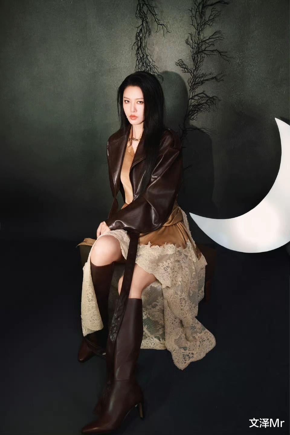 坐在那里的谭维维,身旁的白色月牙道具为画面增添了梦幻感。深棕皮革外套与长靴相呼应,蕾丝裙摆自然垂落,整体造型既时尚又不失浪漫。她的眼神看向镜头,带着一丝神秘与魅惑。这种将梦幻元素与时尚穿搭相结合的方式,再次展现了她在时尚领域的无限创意与想象力。