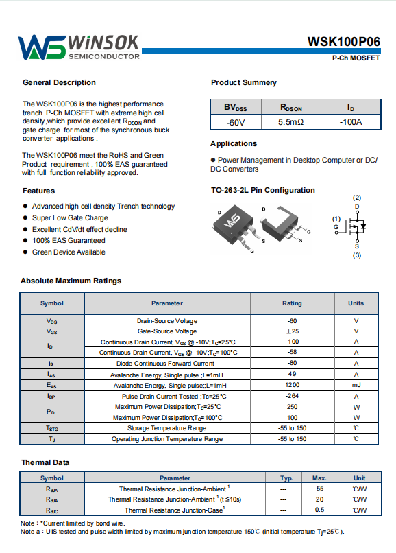 冬季座舱升温速度直接决定电动车用户体验。高压水暖PTC(3-5 kW)需在1 s内从0 A爬升至-80 A,并在电池跌落6 V时仍保持额定功率,对功率器件提出“低导通压降、大电流脉冲、雪崩耐量”三重挑战。微硕WINSOK WSK100P06(-60 V/-100 A/5.5 mΩ,TO-263-2L)凭借P沟高边驱动、5.5 mΩ超低阻与1200 mJ雪崩能量,成为PTC加热器“极速开关闸”首选。