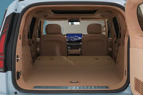 关于空间,这台车给得很足。828升的后备厢,我实测放了两个28寸行李箱、一个婴儿车,还有不少富余。最让我觉得有趣的是它的“多变”。第二排座椅放倒后,整个后部形成一个非常平整的平台,长度超过2.1米,铺上垫子就是一张双人床。有一次露营,我和儿子就躺在车里,透过全景天窗数星星,这种体验是轿车或普通SUV给不了的。车内24个储物格的设计也很实在,门板、中控台、扶手箱,总能找到顺手的地方放手机、水瓶、过路费票据,日常使用起来很顺手。