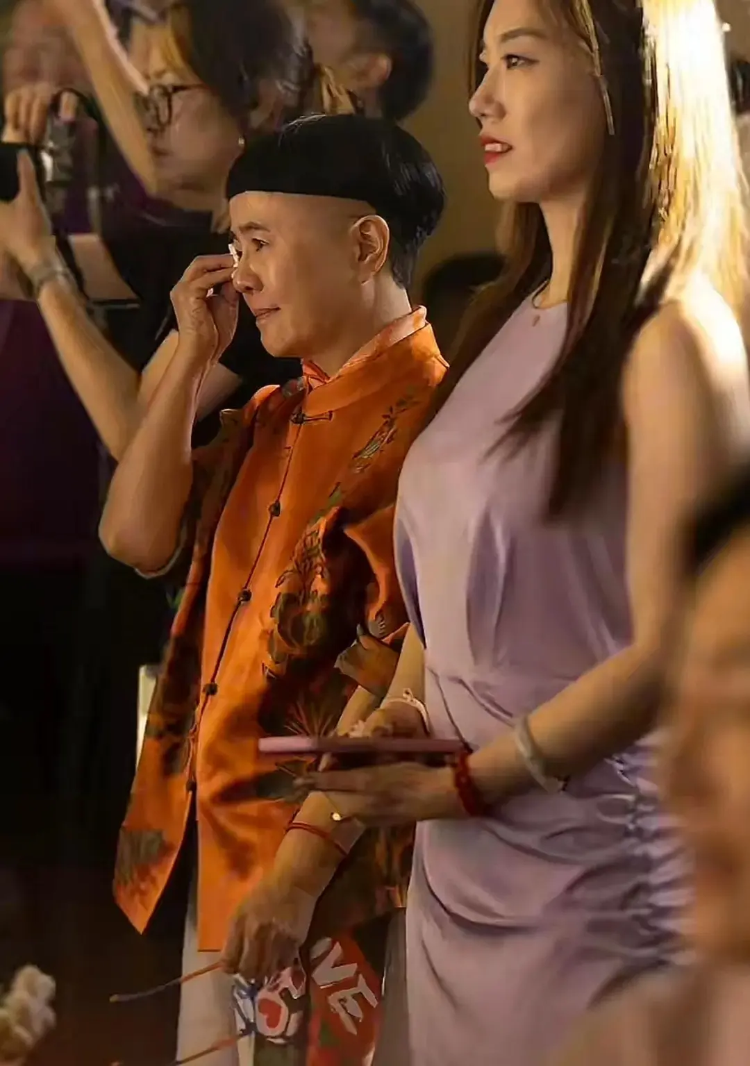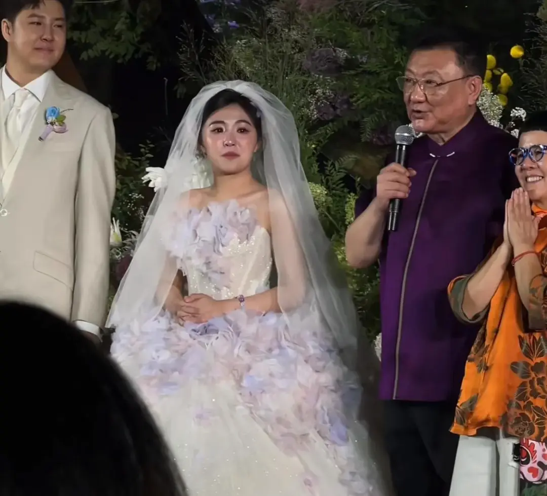 在女儿婚礼上,她身着暖橘色中式刺绣上衣搭卡其色短裤,彰显优雅气质。