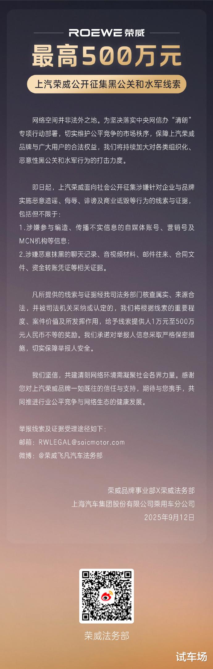 近日,工信部等六部门联合印发《关于开展汽车行业网络乱象专项整治行动的通知》,上汽乘用车积极响应,坚决反对各类组织化、恶意性黑公关和水军行为。自7月29日法务部官方举报微博账号正式开通以来,旗下荣威&MG品牌持续加大维权力度,并于9月12日、9月15日相继发布“最高500万元!上汽荣威公开征集黑公关和水军线索”“最高500万元!上汽MG公开征集黑公关和水军线索”,总计悬赏金额高达1000万元,以实际行动维护公平竞争环境,捍卫品牌以及用户的正当权益。上汽乘用车呼吁行业同仁,严厉打击黑公关与网络水军行为,携手并肩营造清朗、健康、诚信的网络与市场环境。