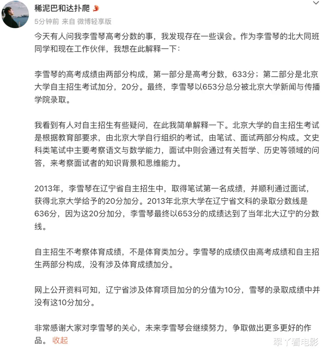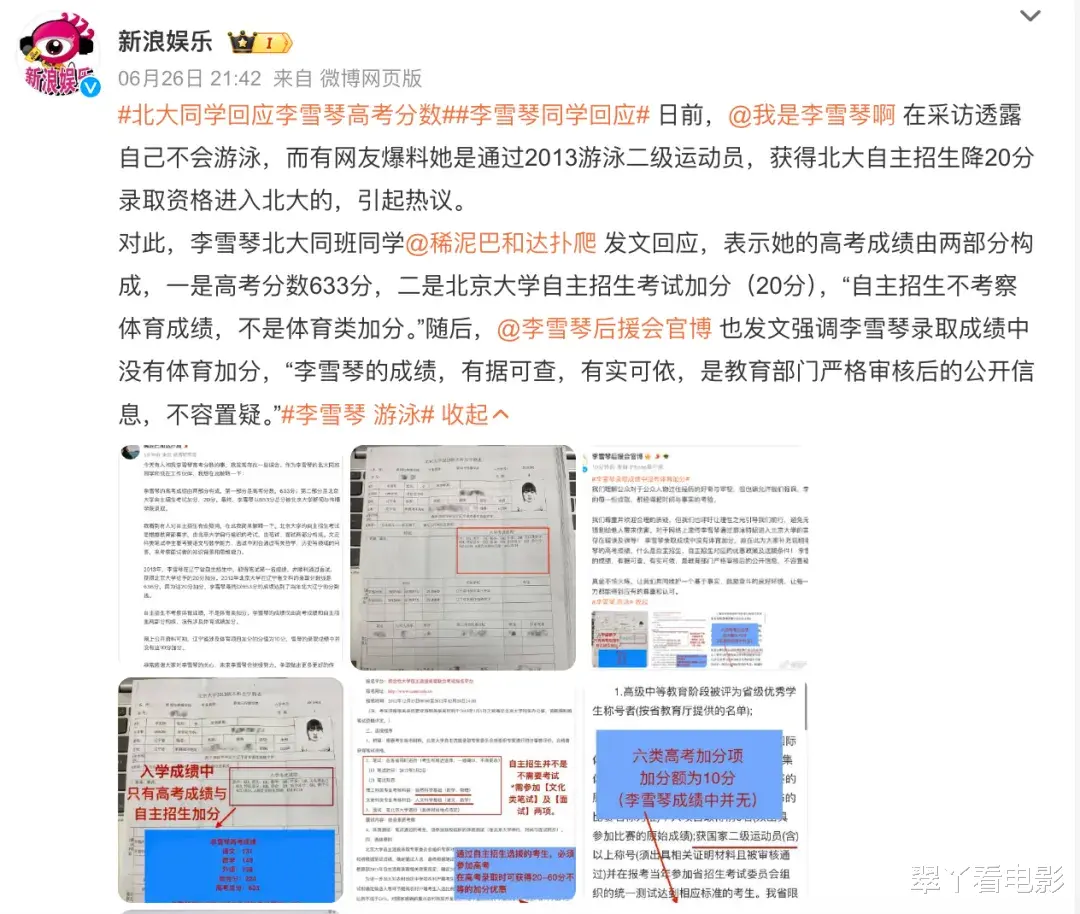 6月26日晚,博主“稀泥巴和达扑爬”发文称是李雪琴北大同学及工作伙伴,李雪琴的成绩仅由高考成绩和自主招生两部分构成,没有涉及体育成绩加分。