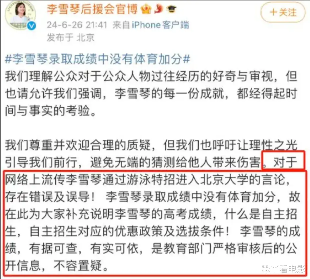6月26日晚,@李雪琴后援会官博 也发文强调李雪琴录取成绩中没有体育加分,“李雪琴的成绩,有据可查,有实可依,是教育部门严格审核后的公开信息,不容置疑。”