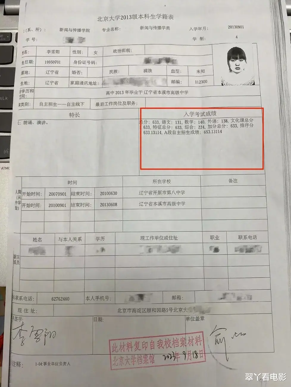 该博主提供的北京大学2013级本科生学籍表上签名为“李雪阳”,而李雪琴曾在节目中透露自己本名为李雪阳。