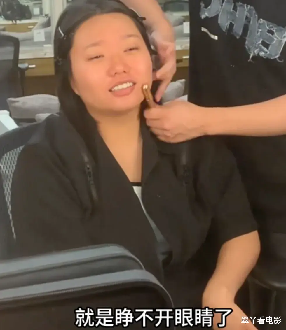 十年前,她经常上课睡觉,一睁眼下课了;十年后她经常化妆的时候睡觉,日常是起大早录节目,眼睛睁不开。