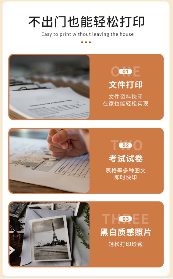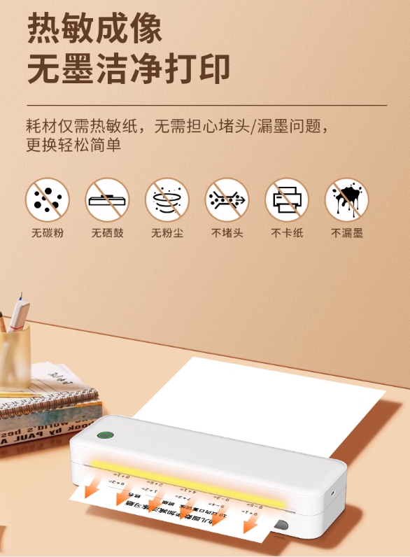 第二个让我惊喜的点是它完全不需要墨盒或碳粉。它采用的是热敏打印技术,开机就能打,没有堵头烦恼,也没有油墨弄脏手的尴尬。对于像我这种怕麻烦的人来说,简直是福音。而且机器本身很干净,打印过程无异味,用起来特别安心。