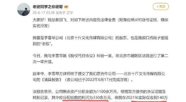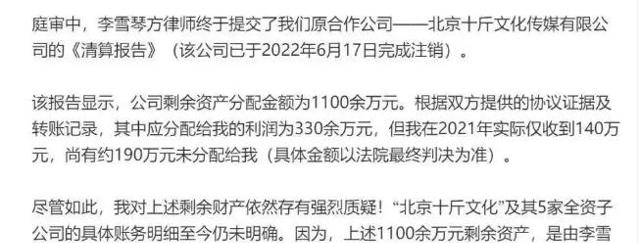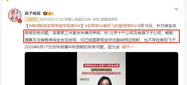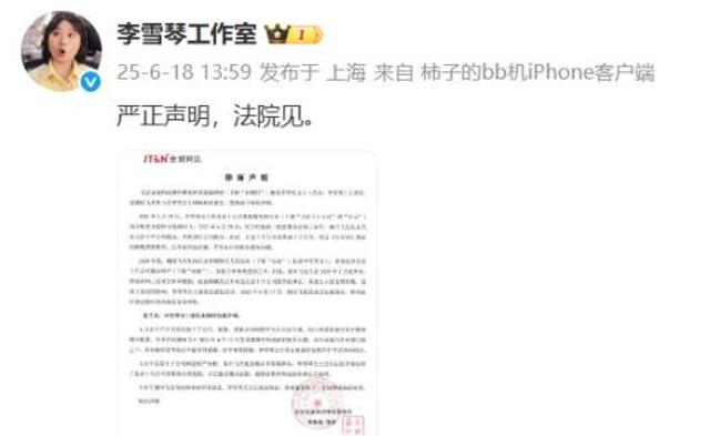 本文信息来源:大江网——2025年6月18日——李雪琴工作室发声明回应被前合伙人实名举报:不存在财务税务问题,法院见