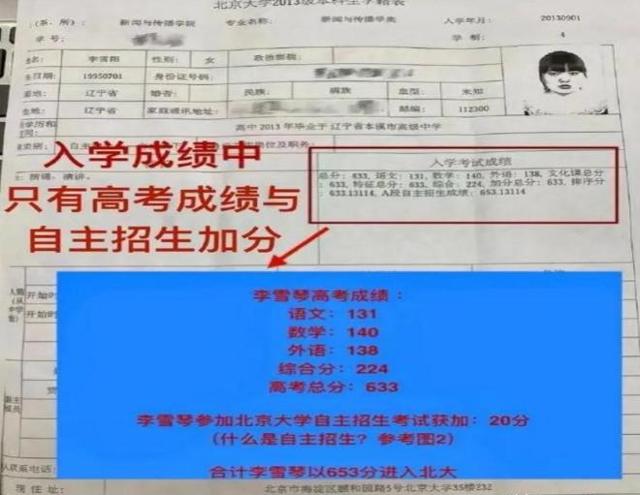 当年李雪琴的高考总分633分,外加上自主招生考试的20分,总共653分进入北大。