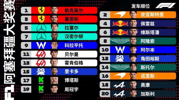 🏁【正赛发车顺位】:勒克莱尔与皮亚斯特里在排位赛中表现出色,将在正赛中从头排发车,塞恩斯携红牛双雄,和梅赛德斯奔驰双星紧随其后,为观众带来精彩的对决。