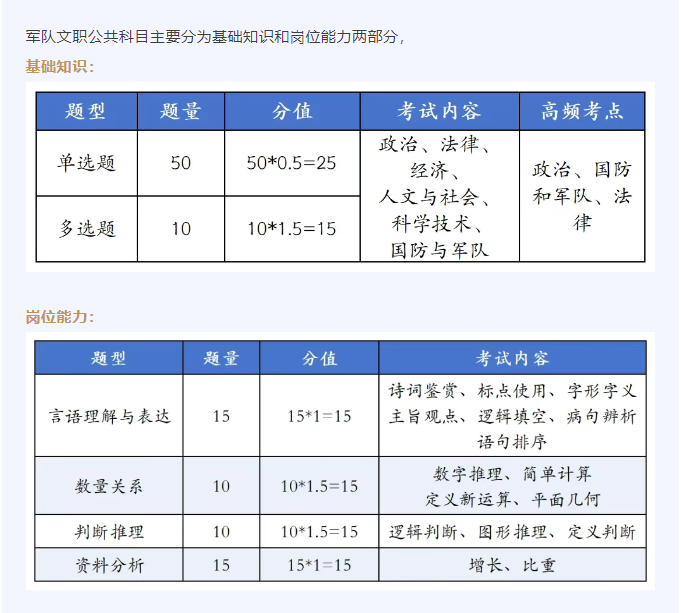 公共科目:所有考生必考,内容涵盖基本知识(政治、经济、法律、人文、科技等)和岗位能力(言语理解、数量关系、判断推理、资料分析)。
