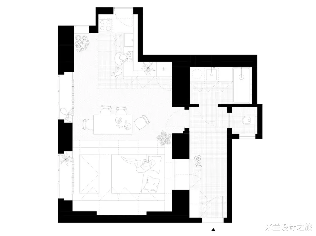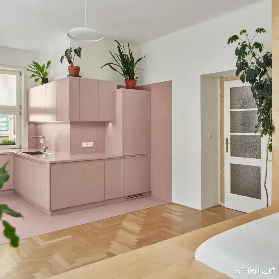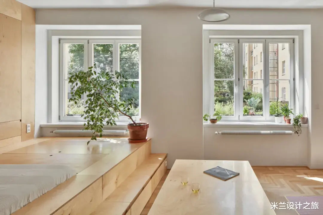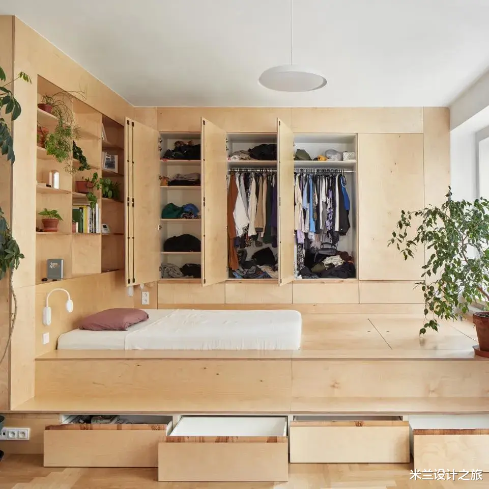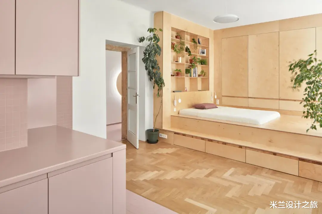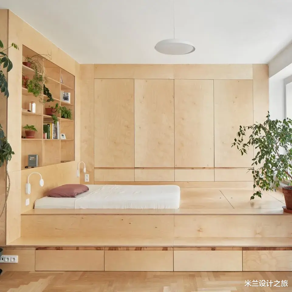 Neuhausl Hunal新作,一间44㎡小公寓,进行室内设计是一项不小的挑战。在这里,一个房间要兼具多种功能:厨房、卧室、聚会场所、储物空间以及衣帽间。设计师把房间分成了厨房区域以及一个设有独特平台式构造的区域。