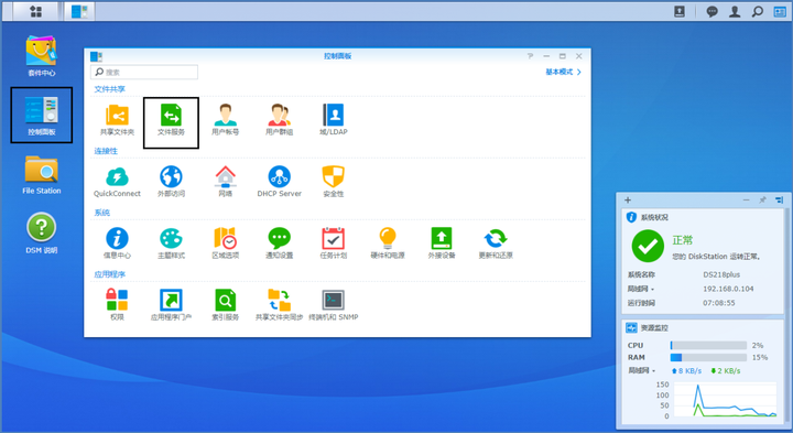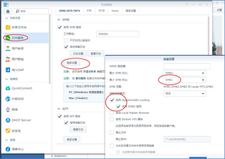 路径是:控制面板 → 文件服务 → 启用 SMB 服务→ 高级设置