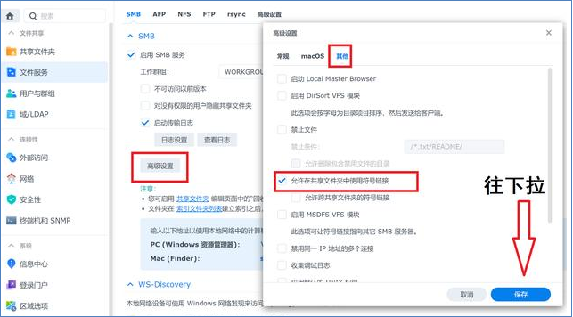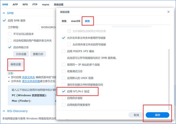 l 在“其他”中勾选“允许在共享文件夹中使用符号链接”和“启用NTLMv1验证”,完成后保存设置