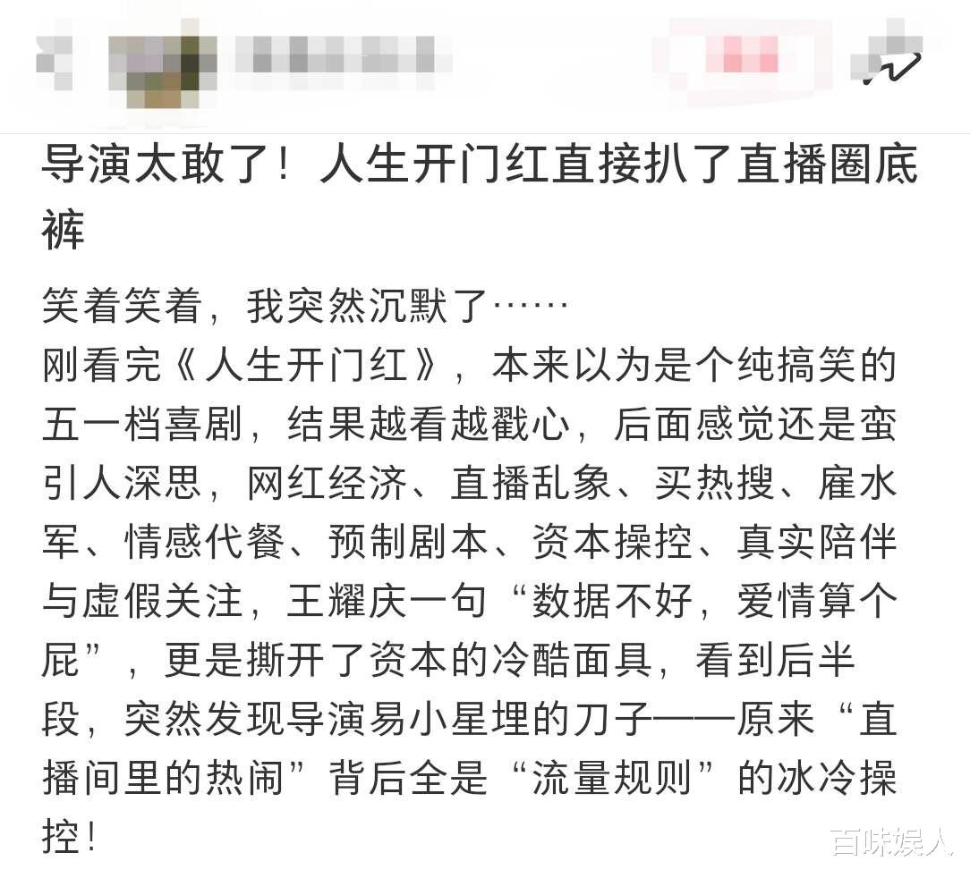 反正平日里我要是劝爸妈别瞎买,说不要过分依赖这些平台的直播,不要轻易被诱惑,多半都会被鄙视,换来一句“你不懂”的回应。可是看《人生开门红》这个片子的时候我就在想,一定要带他们来二刷。