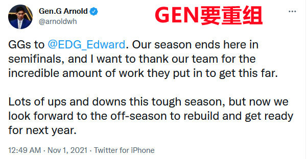 GEN战队的反应GEN战队在止步于4强之后,战队方面表示GEN战队将会迎来重组。