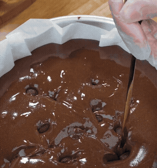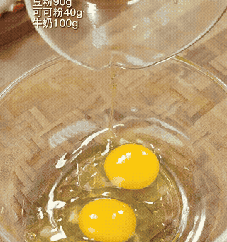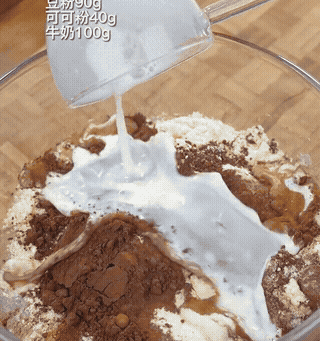 对了,这里加豆粉和可可粉是为了给蛋糕增加营养,又能让蛋糕有浓浓的巧克力香,同时也能在蛋糕表面形成一层特别的保护膜,这样烤出来的蛋糕就不会太干。加牛奶呢,是为了让面糊更湿润,这样蛋糕吃起来就会特别的软。
