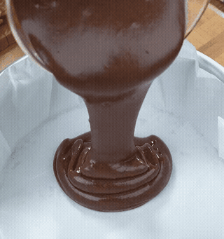 现在我们要把面糊倒进一个铺好烘焙纸的模具里。倒的时候慢一点,别倒太快,就像这样。