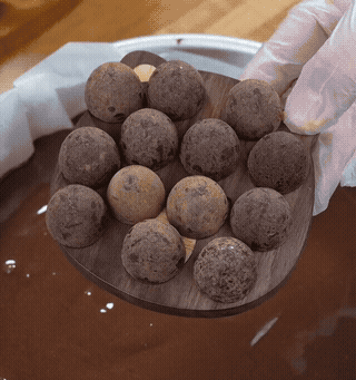 现在到了关键的一步了,我们要往面糊里塞巧克力松露。这里一定要多放一点,因为巧克力松露在烤的时候会融化,融化以后就会变成蛋糕内部的夹心,吃的时候咬下去,巧克力香浓郁,就特别满足。