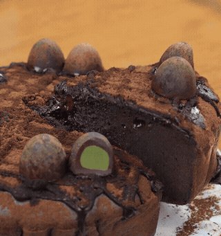 最后,我们用几颗巧克力松露点缀在蛋糕的表面,就像这样,这样蛋糕就显得特别高级,拍照也特别好看,保证你朋友一看就想吃。