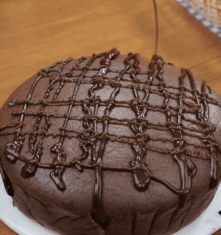 装饰蛋糕现在拿一个小碗,倒点巧克力酱,用刷子或者用挤瓶子,在蛋糕表面挤上一些巧克力酱,装饰得漂亮一点。