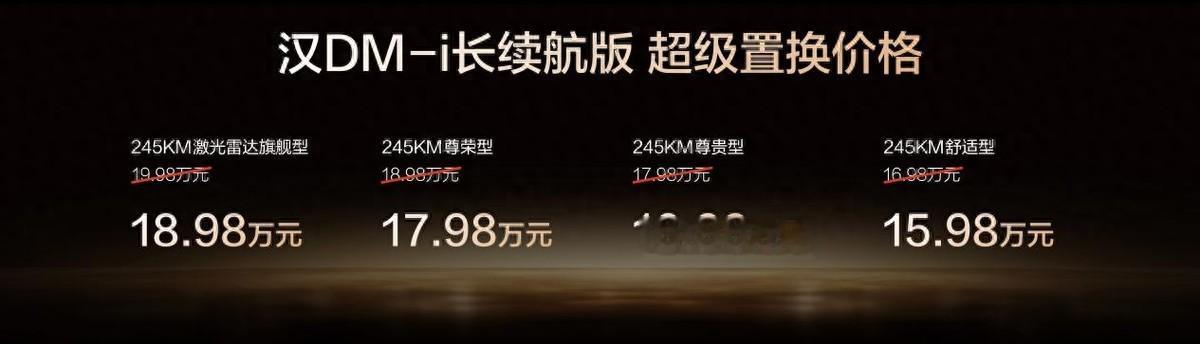 此次,汉DM-i长续航版共推出4款车型,补贴后售价15.98万~18.98万元;汉EV长续航版共推出3款车型,补贴后售价17.38万~20.58万元(10月31日前完成购车可享1万元超级置换补贴)。同时,比亚迪还为用户准备了包含置换补贴在内的至高价值3.8万元七大礼遇。
