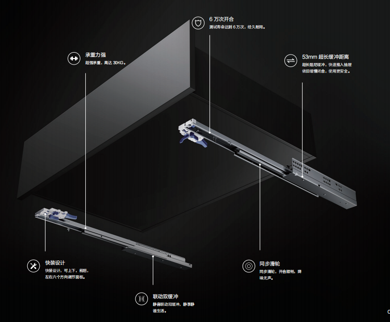 库博同步隐藏轨加载了加长金属阻尼缓冲,缓冲距离达53mm,快速推入抽屉依旧缓慢闭合,使用更安全。