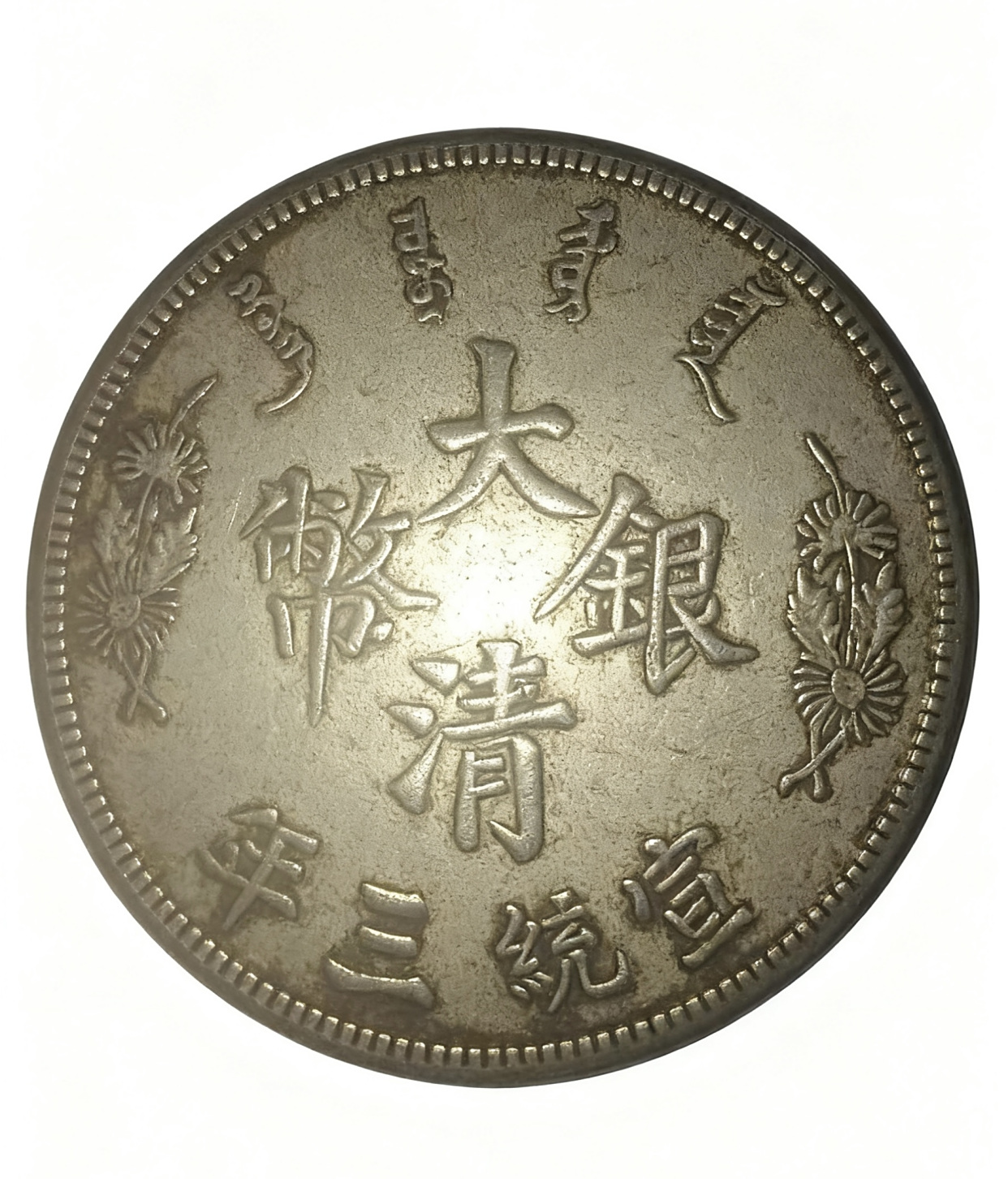 钱币中间汉字“大清银币”,楷书端庄、厚重雄浑,尽显皇家威仪,左右两侧花枝点缀,上书满文“大清银币”,下书“宣统三年”。