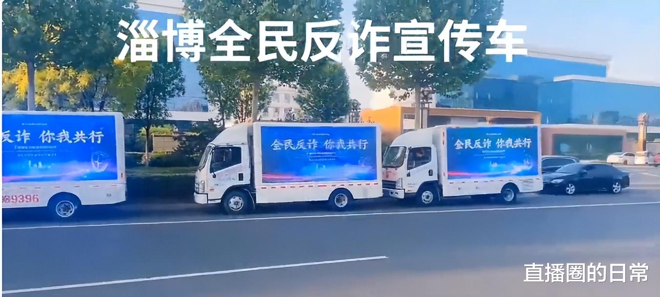 在画面中,宣传车上的声音高亢而坚定,广告词清晰可闻:“诈骗犯滚出淄博!别给我们淄博抹黑,全民反诈,你我共行!”