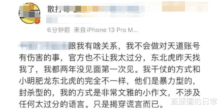 面对舆论的喧嚣,“散打哥”迅速发声澄清,强调自己与此事毫无关联!他否认诈骗车是自己安排的:“这跟我有什么关系,我不会做对天道账号有伤害的事情,官方也不让我太过分。我干仗的方式跟‘东北虎、肥龙、小明’完全不同,他们是暴力型的、封杀型的,而我的方式是非常文雅的小作文,不涉及任何过分的语言,只是揭穿谎言而已。”