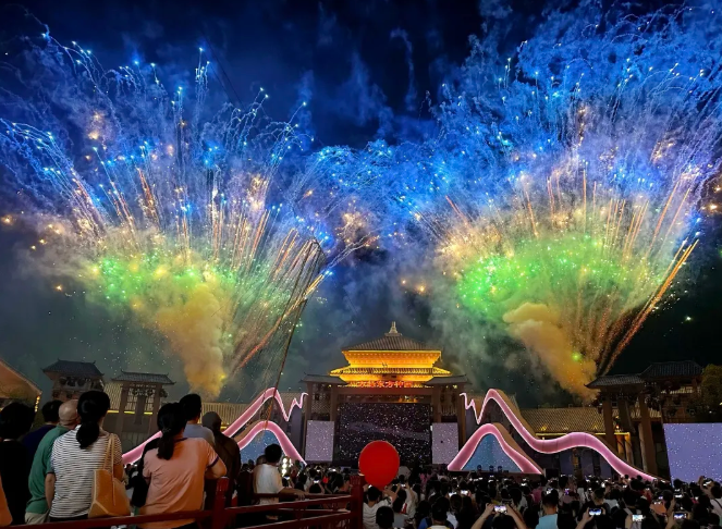 夜幕降临,方特东方神画摇身一变,成为梦幻之境。国家级非遗 “周家班” 唢呐声声,激昂豪迈;歌手井胧深情献唱,余音绕梁。国庆前 6 日,无人机编队每晚在夜空勾勒绚丽图景,8 天连番绽放璀璨烟花,将苍穹装点成银河般壮美。鸠兹演艺小镇内,菊花竞相绽放,如入莫奈画卷,《悟道徽商》实景演出震撼上演,非遗打铁花迸溅万千星火,新版《大江镖局》演绎徽商传奇,游客于馥郁花香中,触摸历史的温度。