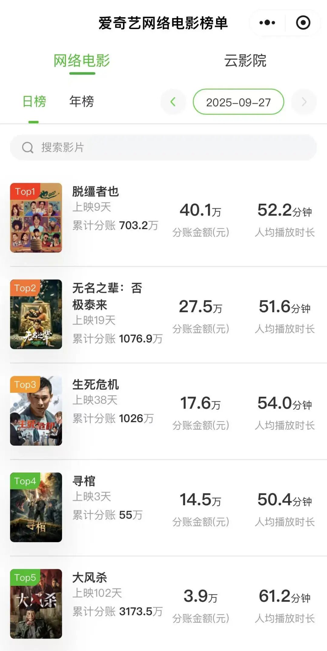 除了《捕风追影》《不说话的爱》的亮眼成绩,另一组数据同样不可忽视。在今年5月爱奇艺开放院线电影分账合作后,《大风杀》至今收获3173.5万线上分账收入,其院线分账为1815.2万;《无名之辈:否极泰来》上线19天分账1076.9万,其院线分账为1689.7万。而近期新片中处于低谷的《脱缰者也》,院线分账只有456.1万,上线9天则已分账703.2万——若按其流传的千万级成本,至少片方不会亏本了。