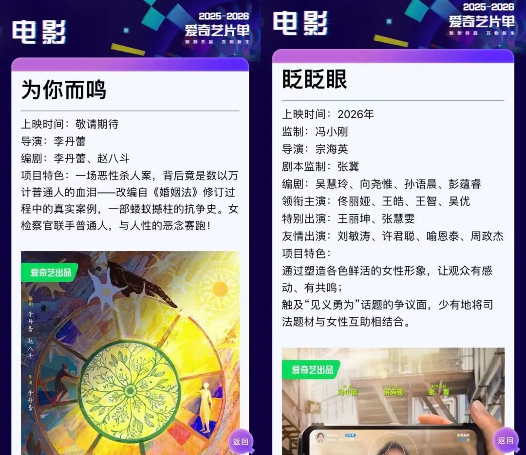 同时重要的是,针对女性和男性的内容创作“教条”也将被打破。从近阶段的女性内容偏好来看,行业需要尽快彻底打破女性只爱看偶像言情的刻板认知,全类型的女性内容题材将会涌现——这一点反映到爱奇艺的电影开发中,已经超前迭变,在已经处于前期筹备、剧本开发甚至制作阶段的项目中,我们可以看到包括司法、怪谈等多个新女性题材内容的存在。