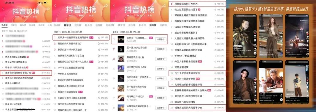 而诸如“谁懂红人流光复古风穿搭的含金量”、“跟电子闺蜜晒红人秋日穿搭”等关联热点,则陆续引发更多社交圈层关注,促成趋势出圈。其中,由魏凡舒baby、溶溶RONGRONG、欢姐0220等红人联合发起的“跟电子闺蜜晒红人秋日穿搭”挑战赛热点访问次数超2亿。