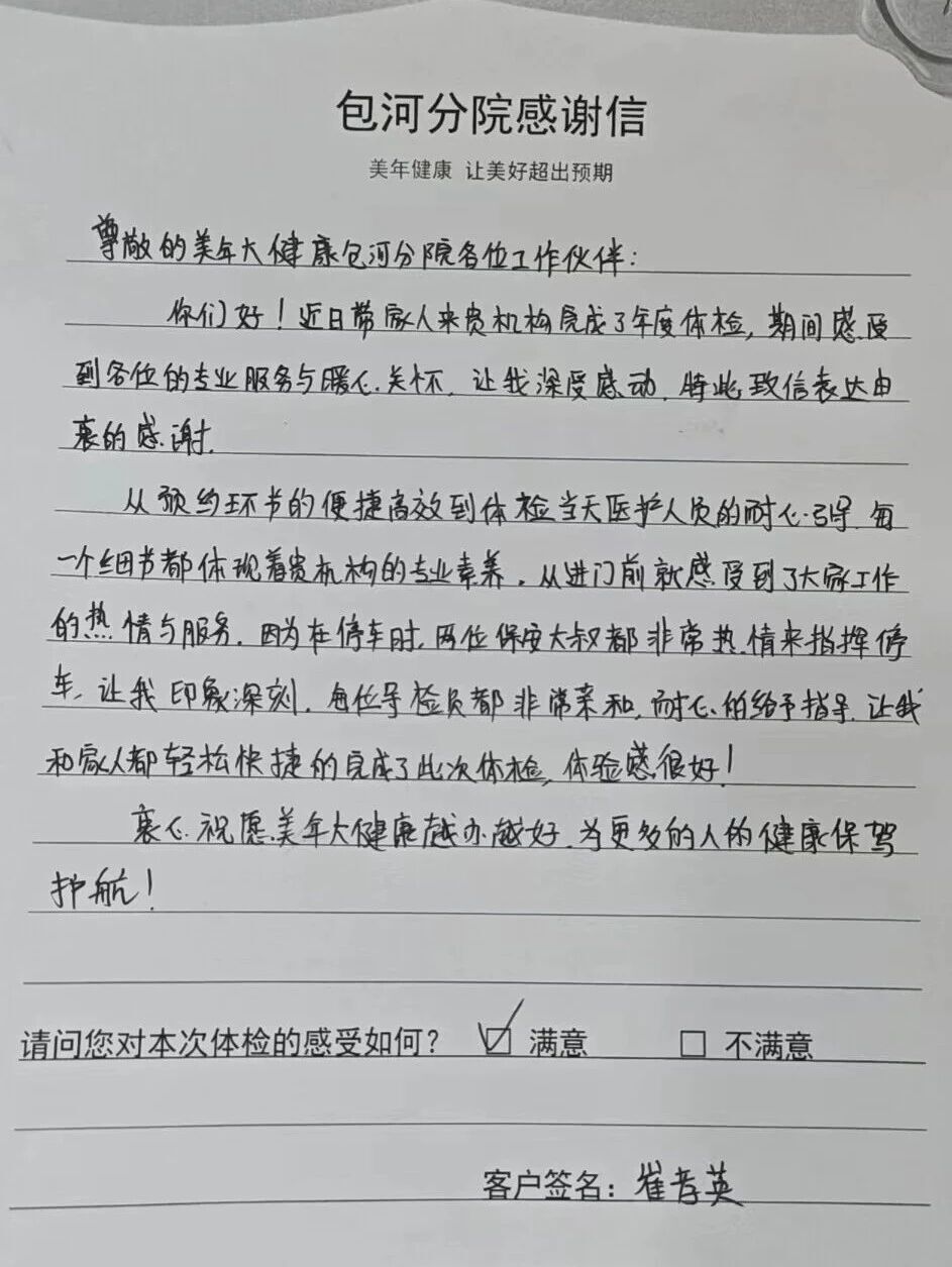 “带家人来做年度体检,从进门到结束,每一步都觉得踏实又暖心!” 这是崔女士在感谢信里写下的第一句话。作为合肥美年大健康在城南的核心服务站点,包河分院不仅覆盖周边居民的日常体检需求,还经常承接社区家庭体检套餐,崔女士的体验正是分院 “家庭友好型” 服务的缩影。