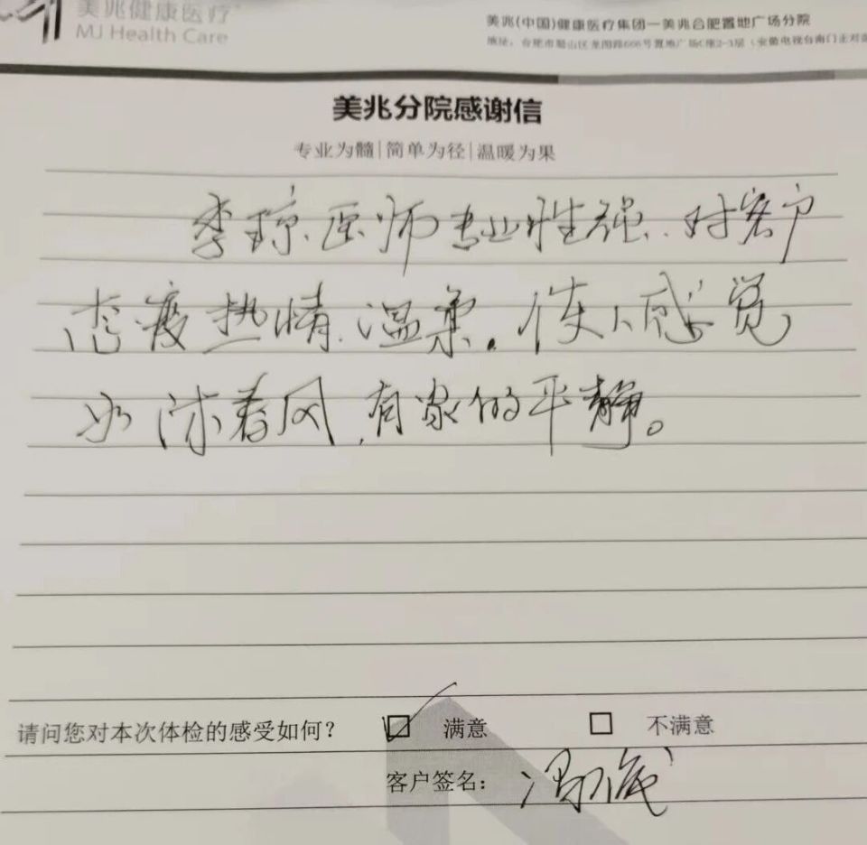 “李琼医生让我觉得,体检不是冰冷的检查,而是像和家人聊天一样舒服。” 冯先生的感谢信,专门提到了美兆分院的李琼医生 —— 在合肥美年大健康,这样兼具专业素养与暖心服务的医护人员,正是机构在 “合肥体检” 领域站稳口碑的核心底气。