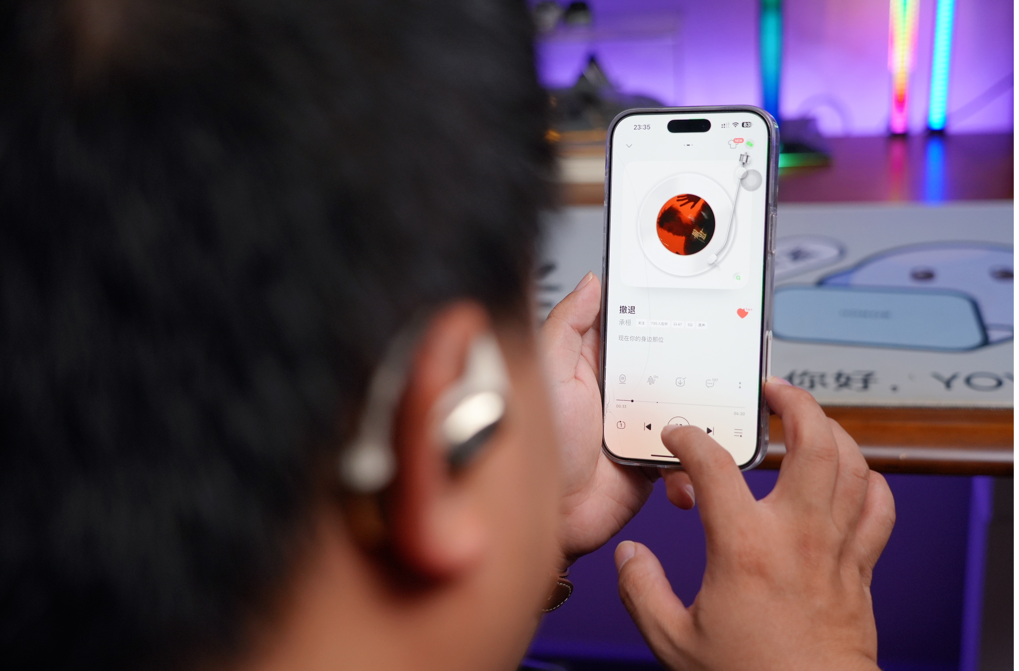 说实话,拿到耳机前我对开放式音质不抱期待,但SuperBass5.0单元和SuperSoundOS2.0声学系统的组合直接给我上了一课。试听《渡口》时,前奏的鼓点带着弹性和穿透力,低频下潜深度媲美入耳式耳机,蔡琴的人声温润饱满,连换气声都清晰可闻。