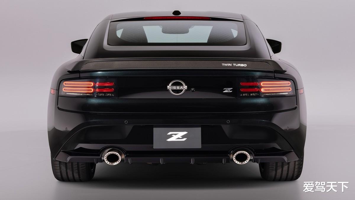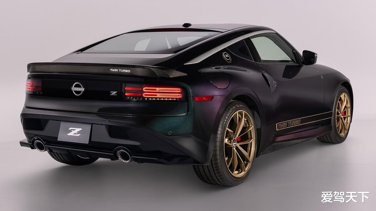最值得一提的是,车身侧面的古铜色轮圈、醒目的红色刹车卡钳、饱满的后翼子板肌肉线条、Z系列标识,以及侧裙“TWIN RURBO”拉花设计,无一不在强调其性能属性和车身格调。车尾部分,2026款Z Heritage Edition配备动感十足的碳纤维尾翼,并在右下角嵌入“TWIN RURBO”英文标识,分体式尾灯则采用与前包围同款设计元素,搭配圆形排气管,再一次将性能风推向高潮。