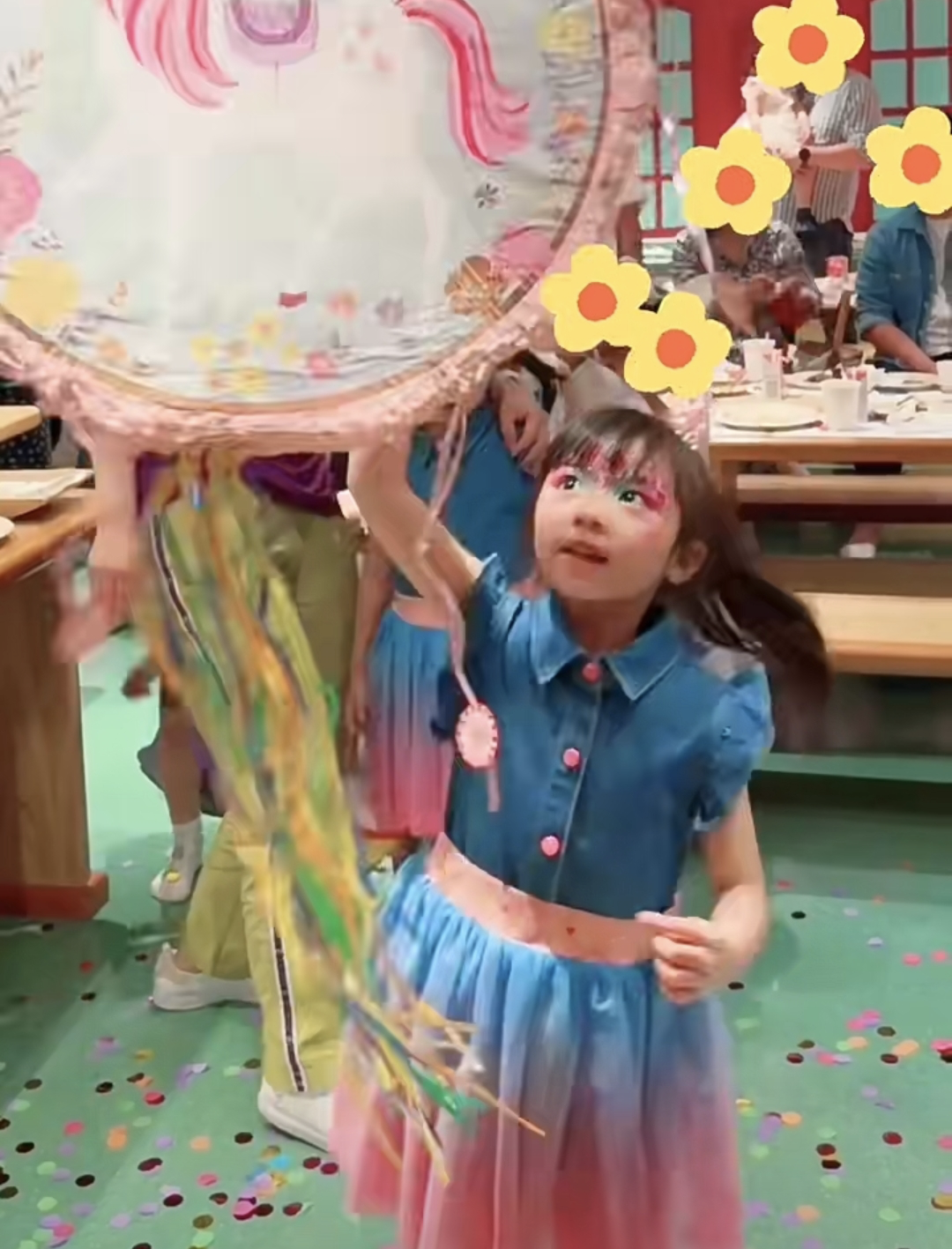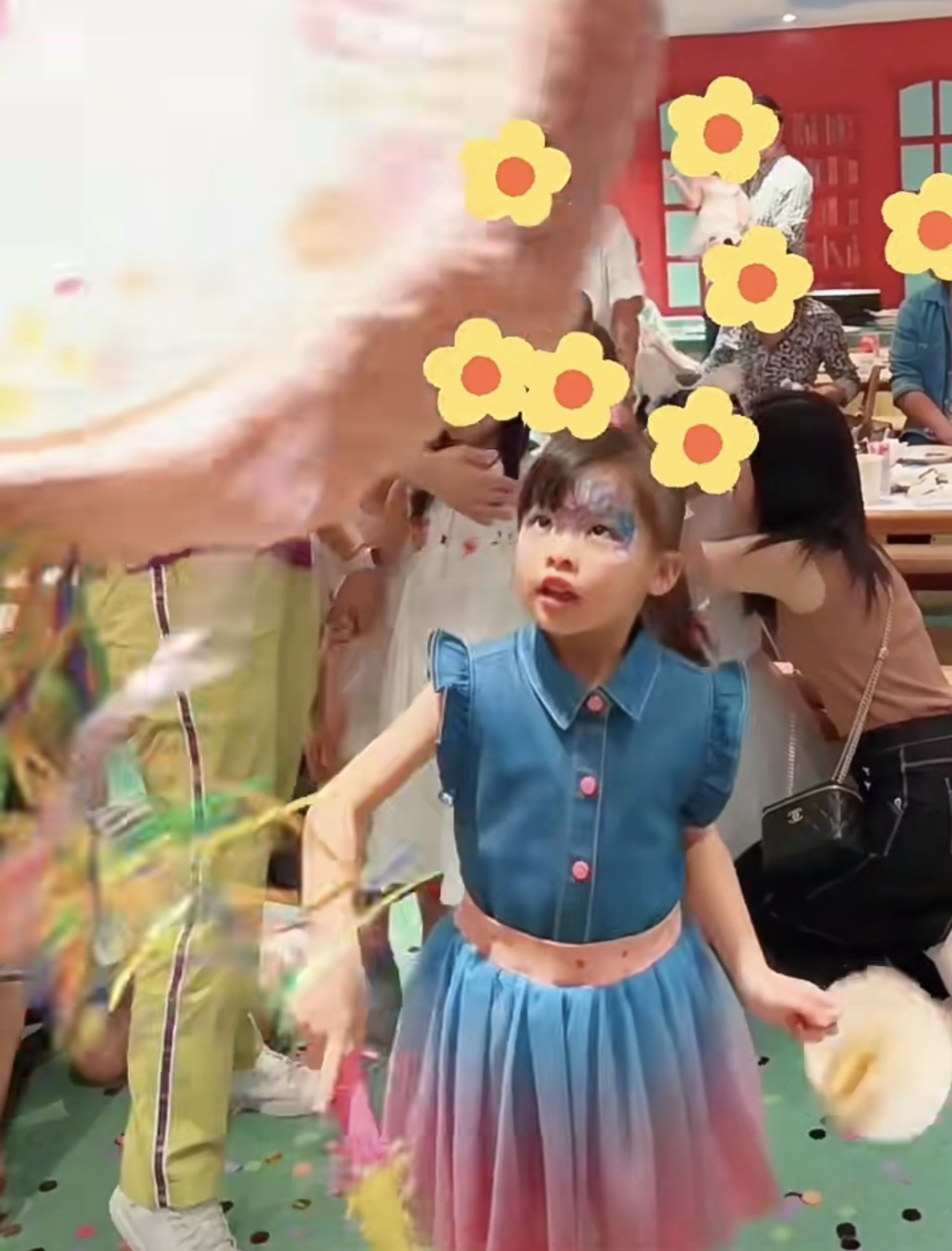 姐妹俩一起身穿蓝色连衣裙,脸上都画了彩绘,一同吹蜡烛。