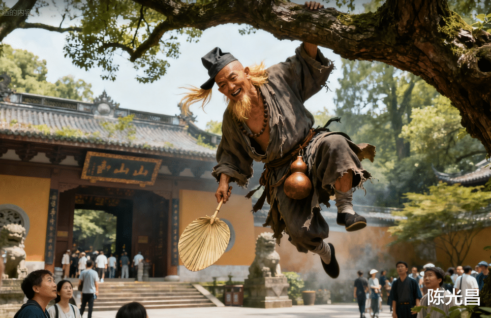 抬头只见个破衣烂衫的和尚踩着树枝飘下来,僧帽歪在一边,露出几缕金毛,手里摇着把缺了齿的蒲扇,腰间酒葫芦晃得叮当响。这和尚落地时没站稳,踉跄着撞在香案上,供果滚了一地,他顺手抓了个苹果塞进怀里,抹了把嘴道:“这块破石头有啥好抢的?洒家昨夜撒尿还见过呢!”