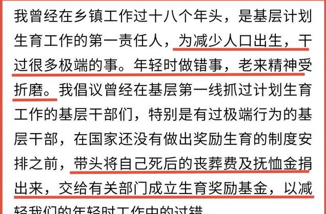 曾经在基层第一线抓过计划生育工作的基层干部们,特别是有过极端行为的基层干部,在国家还没有做出奖励生育的制度安排之前,带头将自己死后的丧葬费及抚恤金捐出来,交给有关部门成立生育奖励基金,以减轻我们的年轻时工作中的过错。