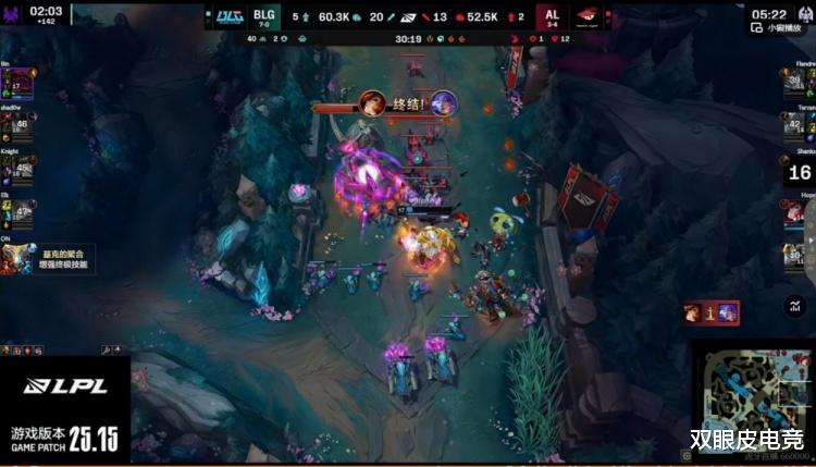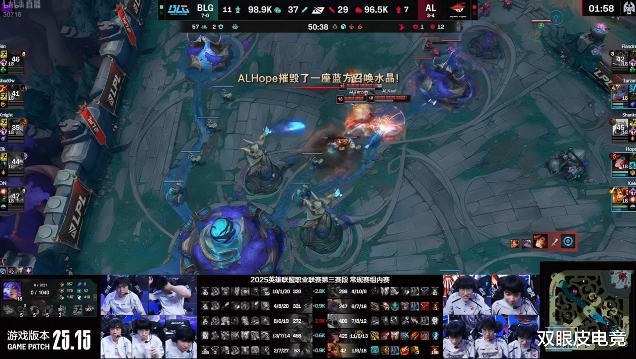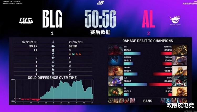 时间到了50分钟第二天条远古龙团,BLG众人先是打醒远古龙,不知道是不是没沟通好的原因,也有人打团,也有人打龙。而女枪根本没人近身在后面放大就直接洗完了BLG众人,顺利把这一局鏖战50分钟的比赛拿下,而AL最多落后经济差也差不多快一万了。